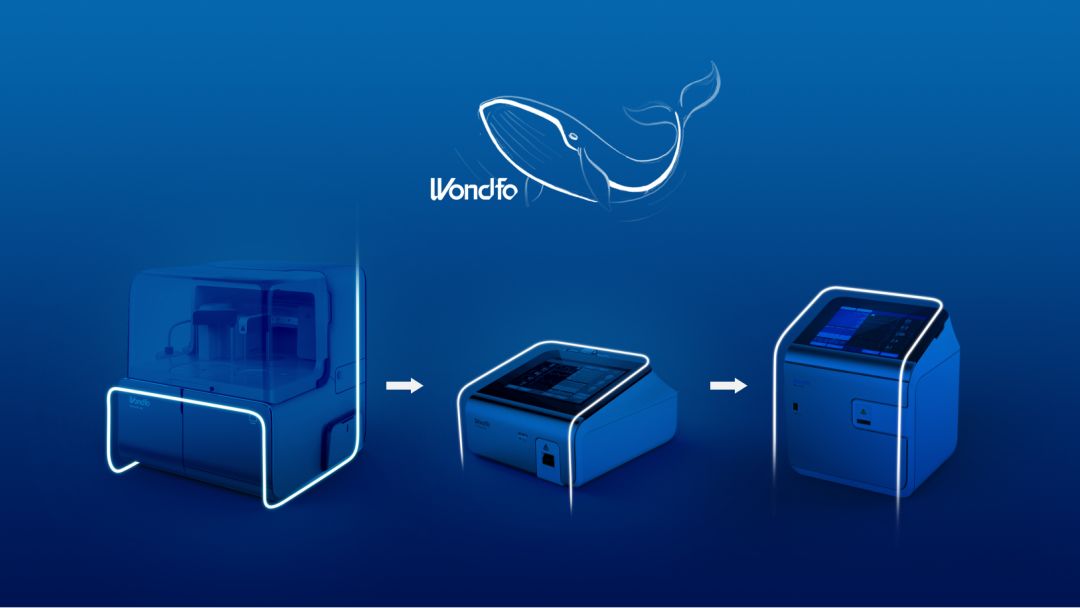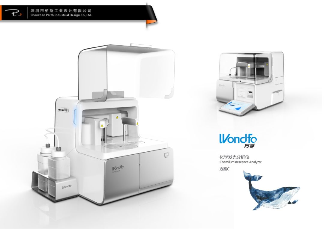 柏斯分析万孚VI系统中的蓝色,然后制定了蓝鲸系列的设计理念,从蓝鲸身上提取线条,成为品牌标记,设计出第三阶段体系里的第一件产品——用于检验血液的化学发光分析仪。然后,又以此线条,设计出第二个产品,一直延续到第七款。万孚的产品,品牌体系识别度就非常明显,为进入第四阶段策略性设计奠定了基础。